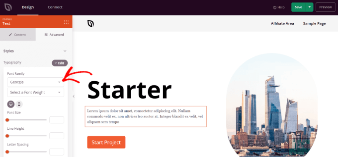 The drop-down choice next to "Font Family" lets you pick a font for your text. You can also choose the font weight, change the size, line height, letter spacing, orientation, case, and more.