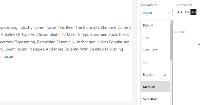 To change the font style, just click the dropdown menu next to Appearance. You can change the style to be bold, thin, italic, black, bold italic, extra bold, and more.