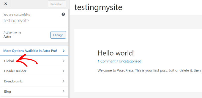 Options to change site-wide styles are available in the "Global" area of the Astra theme. To change the font on your entire website, go to the button on the left and select "Global."