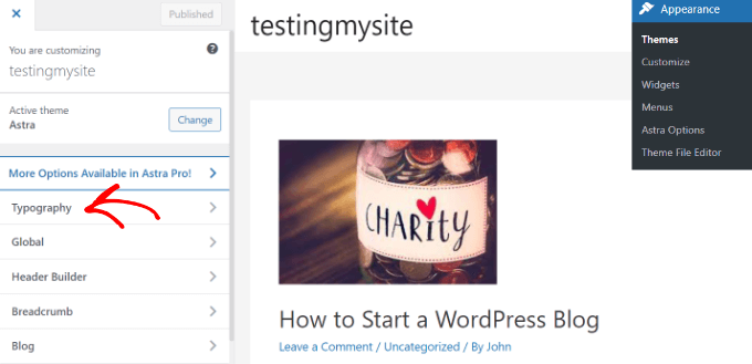 Going to the WordPress theme customizer is a simple way to change the font on your site. It lets you change the appearance of your website and show a preview in real time.